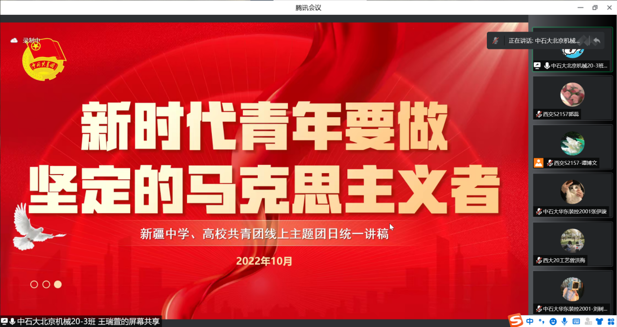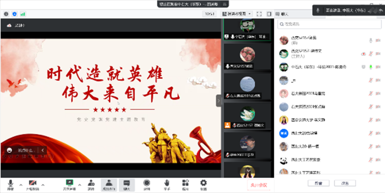 化学工程与工艺团委2020级1班团支部、中国石油大学(北京)机械20-3团支部、中国石油大学(华东)装控2001团支部、装控2003团支部、环设2001团支部联合开展了“喜庆二十大,一起学历史”主题理论学习与交流活动。