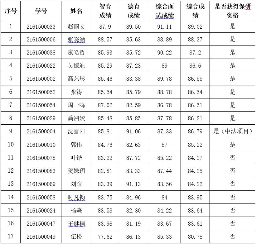 推荐2020届优秀本科毕业生免试攻读硕士学位研究生工作办法》,经过智育、德育成绩核算以及综合面试等环节,我院叶芊昊等22名同学(含竞赛保研、中法项目)获得推荐免试攻读硕士研究生资格,现予以公示。
