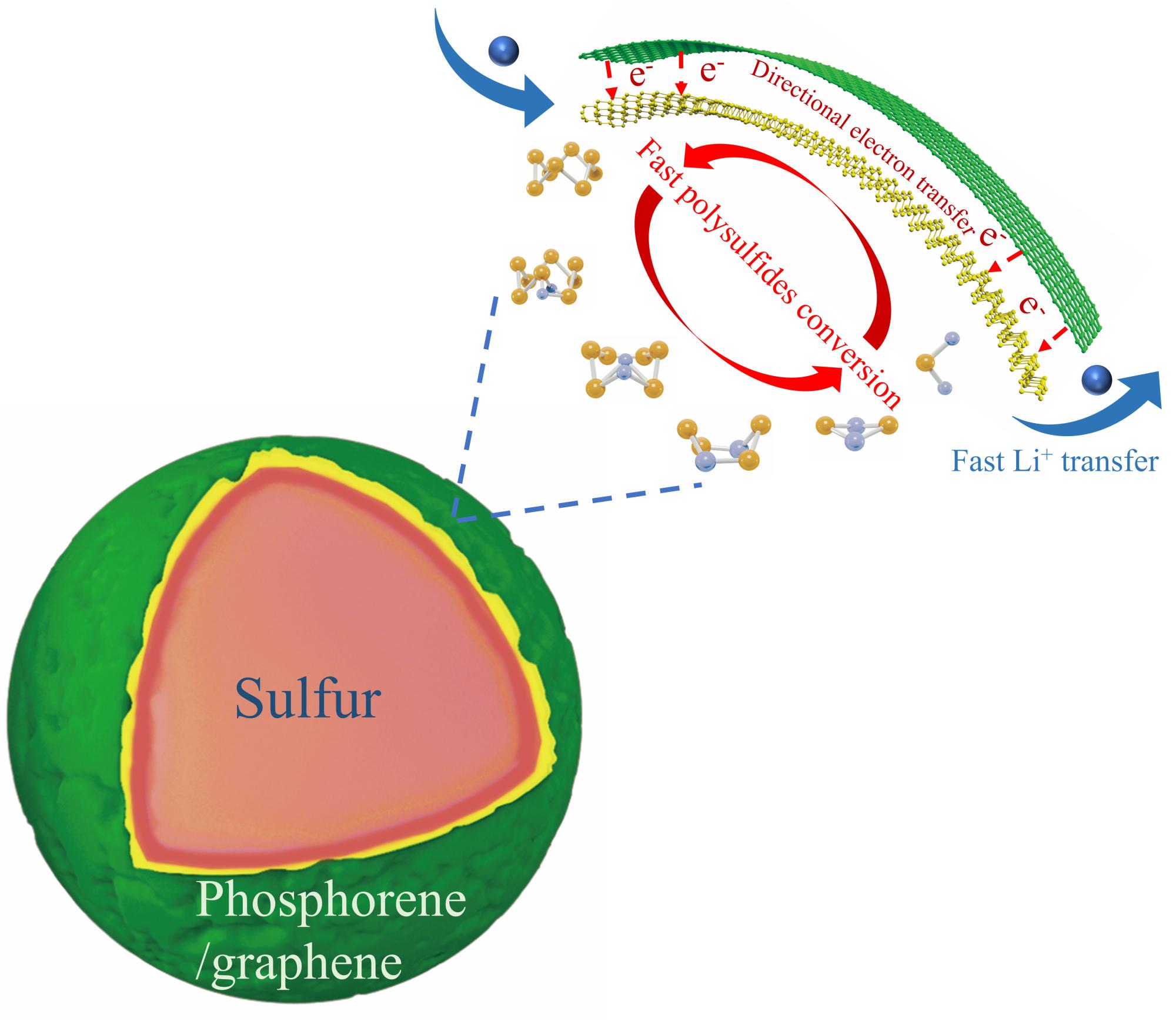 锂硫电池具有理论能量密度高、成本低廉等优点,在动力汽车,无人机,规模化储能等领域有重要的产业应用前景。然而,锂硫电池的产业化仍然面临循环寿命、安全性、和实际输出功率低等难题。硫正极在循环过程中产生的中间产物多硫化物的溶解和流失是电池失效的罪魁祸首,尤其是在高硫负载量和贫电解质条件下。在锂硫电池正极一侧引入催化剂,加速多硫化物氧化还原反应,是缓解“穿梭效应”的有效手段之一。少层磷烯纳米片是由于其大的层间距(约3.08 Å),高亲硫性,高催化活性和低密度(2.69 g cm−3)等特性被认为是理想的硫正极材料。然而,少层磷烯纳米片有限的导电性(半导体特性)和不稳定性(快速氧化和降解)严重阻碍了其潜在应用。因此设计合适的具有协同功能的2D/2D异质结构是调整材料特性并为锂硫池提供新功能的关键。并且充分探索其内在的协同相互作用并加深理解扩大基于少层磷烯纳米片的异质结构的应用领域的机制。