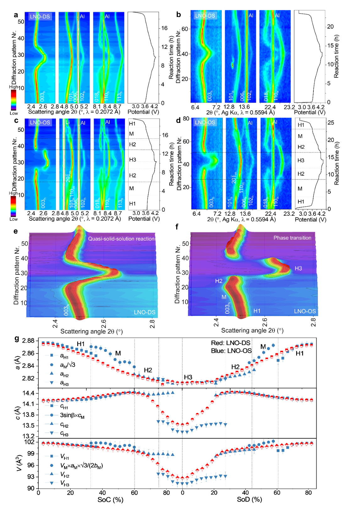 滑纬博特聘研究员团队与德国卡尔斯鲁厄理工学院(KIT)、布鲁克海文国家实验室(BNL)和西班牙同步辐射中心(ALBA)等相关科研人员合作,利用原位同步辐射衍射(SXRD)、透射式X射线显微镜(TXM)和X射线吸收近边结构(XANES)组合的成像技术深入解析了镍酸锂(LNO)材料在循环过程中的结构演变、形貌特征和价态变化,并通过控制表面阳离子无序度,促使镍酸锂正极材料表面形成一层纳米级的无序层状保护膜,大幅缓解材料在循环过程中的氧气析出和机械失效,从而显著提升其循环稳定性和热稳定性,如图1所示。同时阐明了由于晶格氧析出造成颗粒内部形成三维大孔结构是导致材料容量快速衰减的主要原因,如图2所示。此外,原位同步辐射衍射进一步揭示了具有不同表面结构的镍酸锂正极材料在循环过程中表现出两种不同的相变机制,如图3所示。该研究工作为提高镍酸锂的循环稳定性提供了一种新思路,有望推进超高镍正极材料的商业化应用。